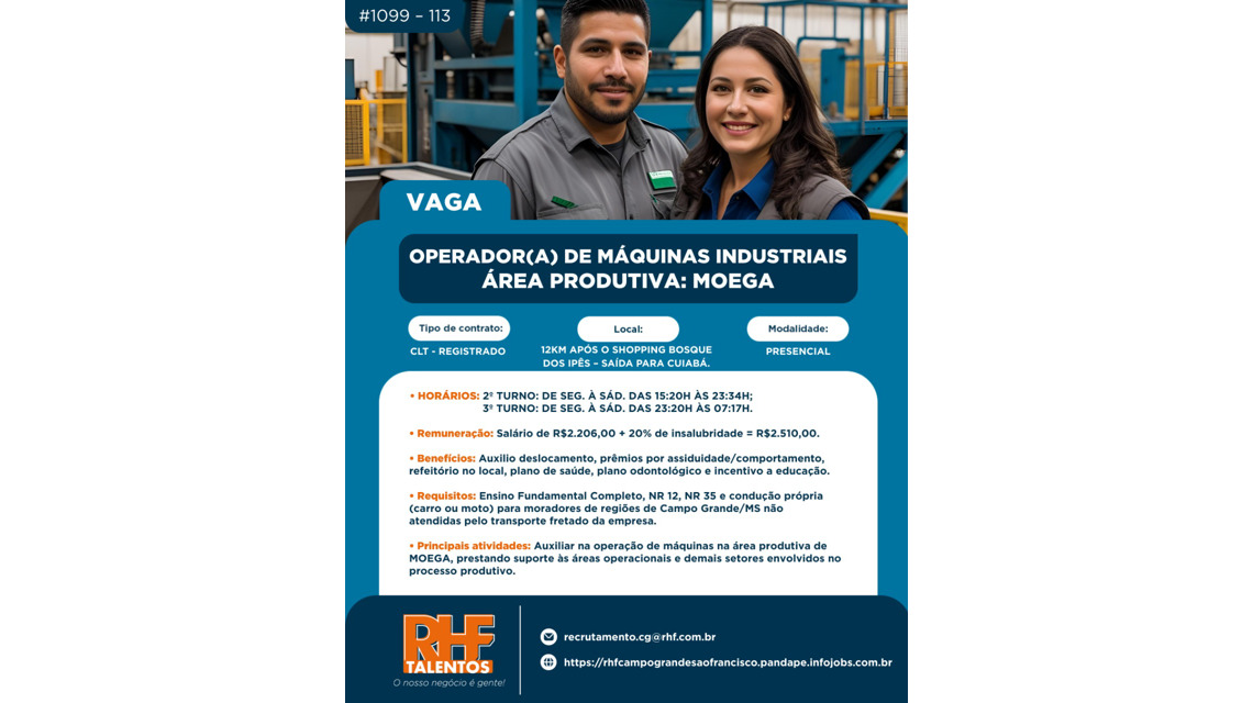 O processo seletivo será aplicado pela RHF - Talentos de CG/MS. O nome da empresa, será confirmado apenas no dia da entrevista por sigilo e a pedido da empresa.