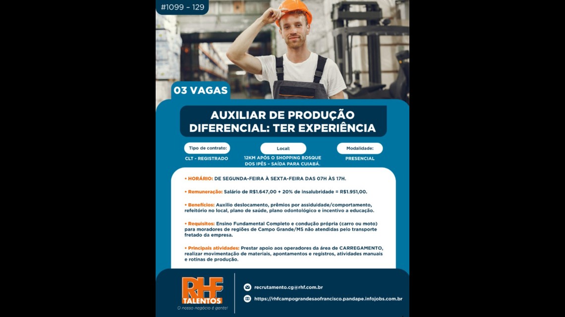 O processo seletivo será aplicado pela RHF - Talentos de CG/MS. O nome da empresa, será confirmado apenas no dia da entrevista por sigilo e a pedido da empresa.