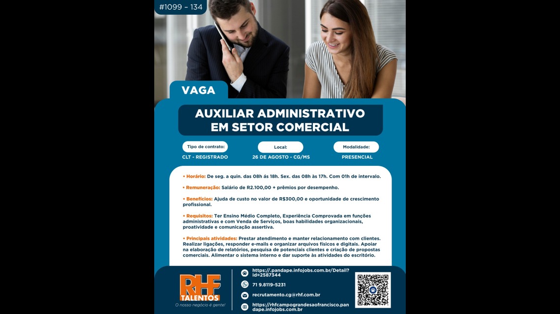 O processo seletivo será aplicado pela RHF - Talentos de CG/MS. O nome da empresa, será confirmado apenas no dia da entrevista por sigilo e a pedido da empresa.
