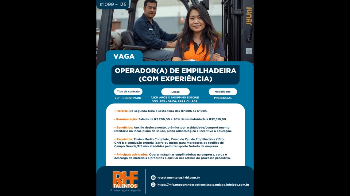 O processo seletivo será aplicado pela RHF - Talentos de CG/MS. O nome da empresa, será confirmado apenas no dia da entrevista por sigilo e a pedido da empresa.