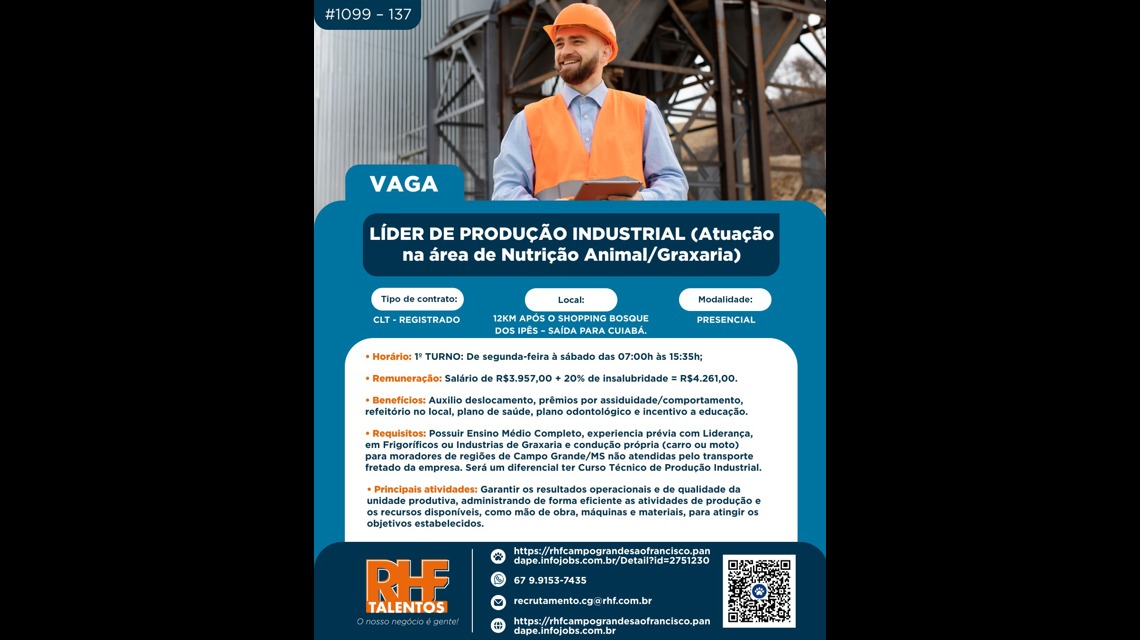 O processo seletivo será aplicado pela RHF - Talentos de CG/MS. O nome da empresa, será confirmado apenas no dia da entrevista por sigilo e a pedido da empresa.