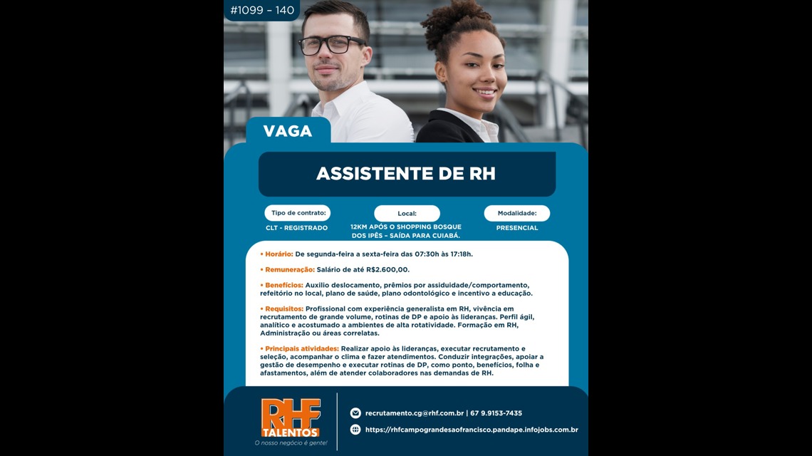 O processo seletivo será aplicado pela RHF - Talentos de CG/MS. O nome da empresa, será confirmado apenas no dia da entrevista por sigilo e a pedido da empresa.