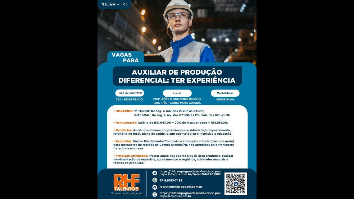 O processo seletivo será aplicado pela RHF - Talentos de CG/MS. O nome da empresa, será confirmado apenas no dia da entrevista por sigilo e a pedido da empresa.