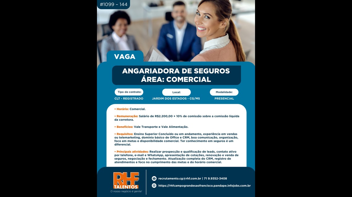 O processo seletivo será aplicado pela RHF - Talentos de CG/MS. O nome da empresa, será confirmado apenas no dia da entrevista por sigilo e a pedido da empresa.