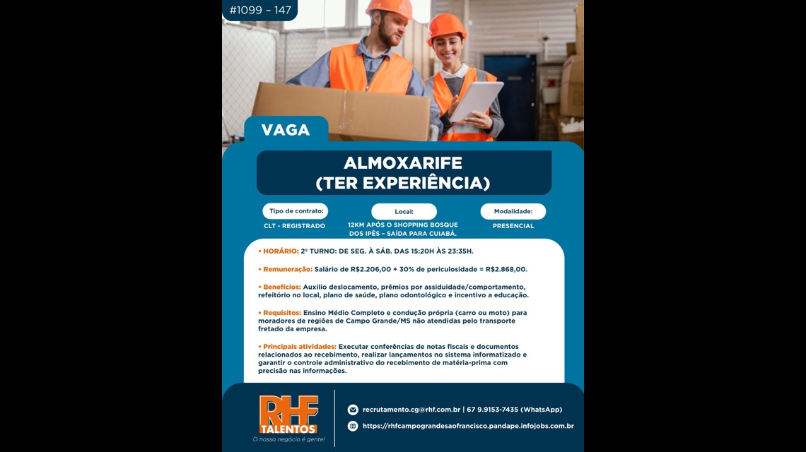 O processo seletivo será aplicado pela RHF - Talentos de CG/MS. O nome da empresa, será confirmado apenas no dia da entrevista por sigilo e a pedido da empresa.