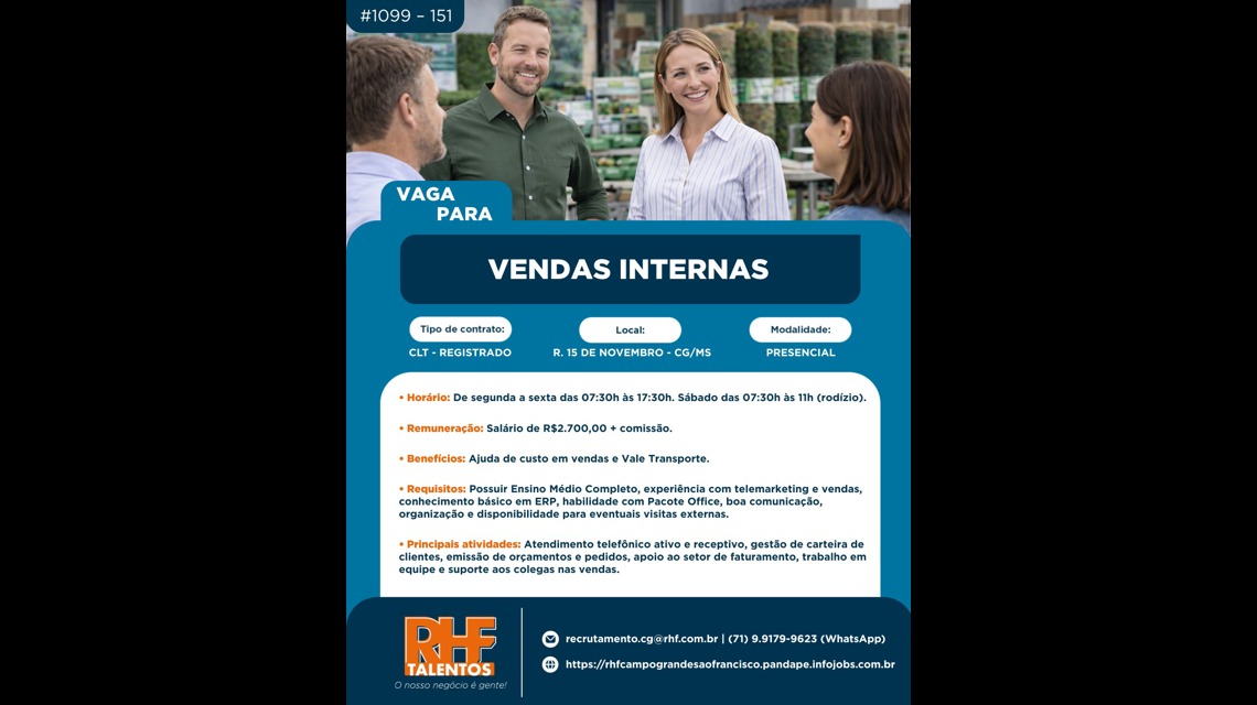 "Empresa consolidada busca profissional experiente na área comercial para integrar a equipe de vendas internas, com foco em relacionamento com clientes e suporte estratégico ao setor."