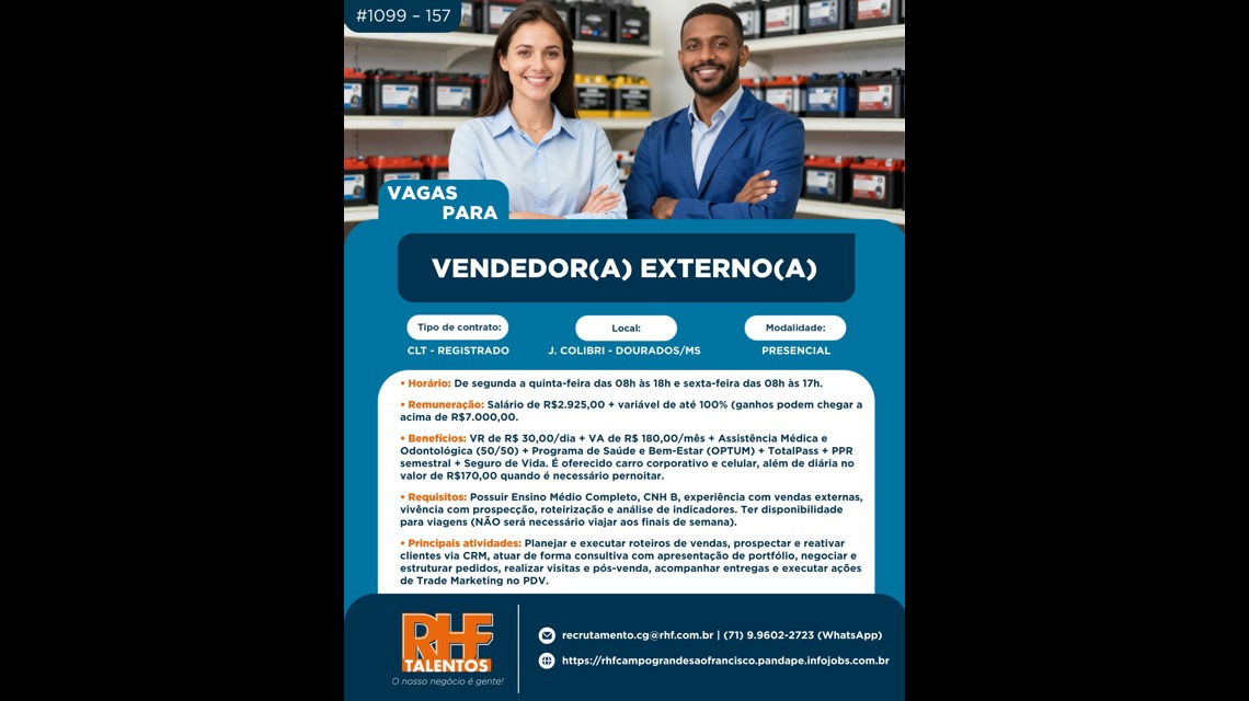 O processo seletivo será aplicado pela RHF - Talentos de CG/MS. O nome da empresa, será confirmado apenas no dia da entrevista por sigilo e a pedido da empresa.
