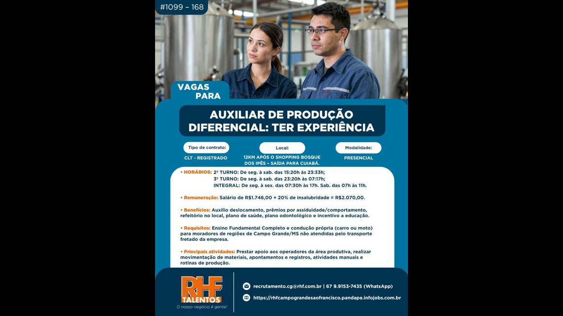 O processo seletivo será aplicado pela RHF - Talentos de CG/MS. O nome da empresa, será confirmado apenas no dia da entrevista por sigilo e a pedido da empresa.
